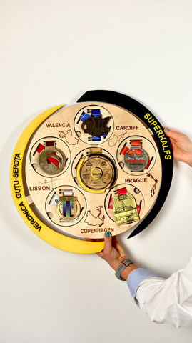 We are a team of people who handcrafted a medal holder specially tailored for the SUPERHALFS marathon.